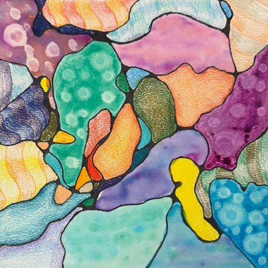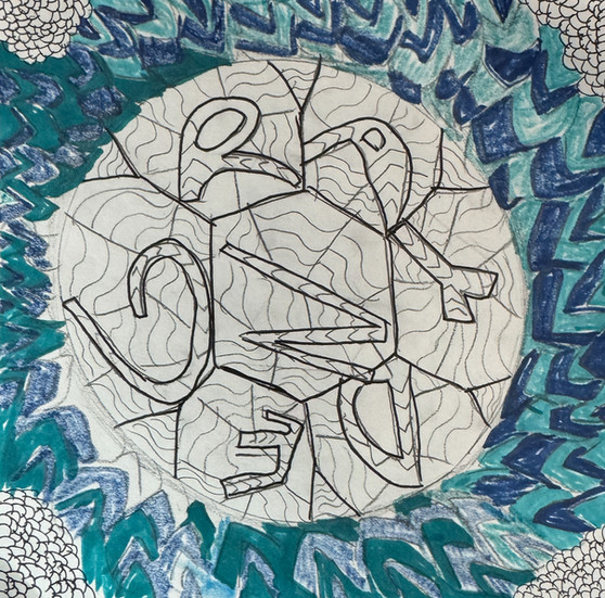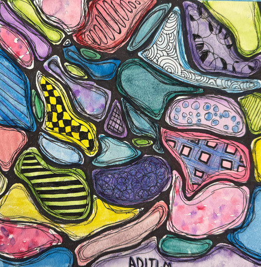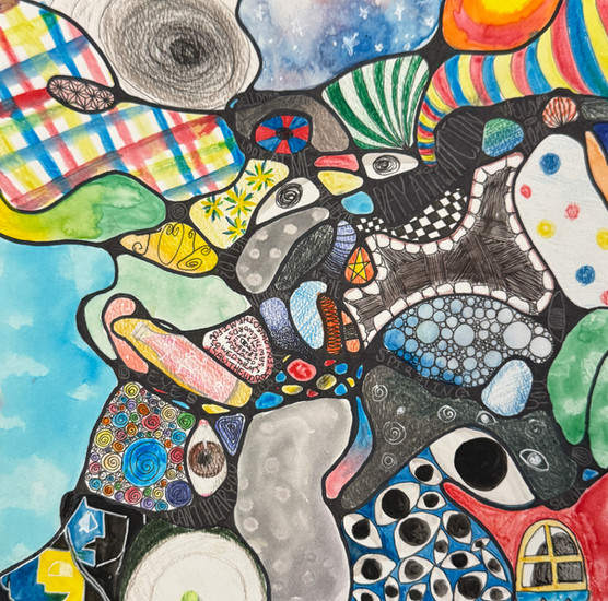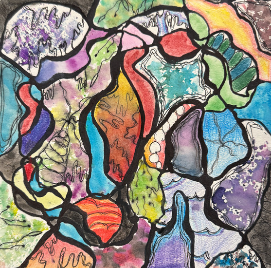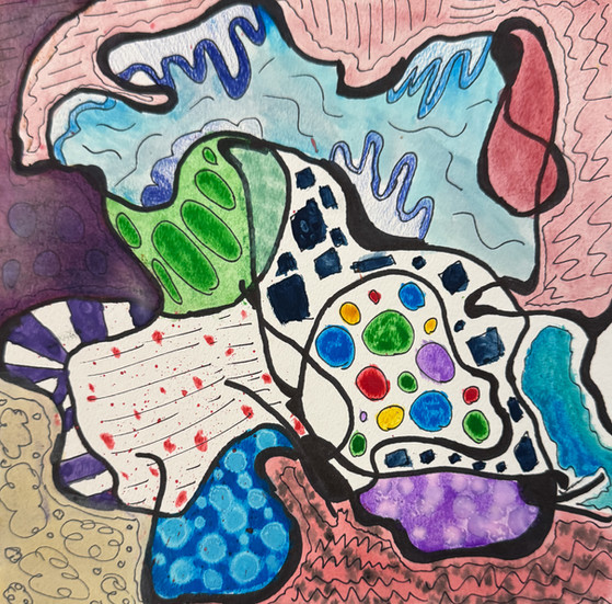 From there, we explored neurographic line art, combining flowing, abstract line patterns with watercolor and colored pencil to create vibrant, expressive pieces. These projects not only introduced students to new techniques but also encouraged them to think about how art can reflect both identity and imagination.